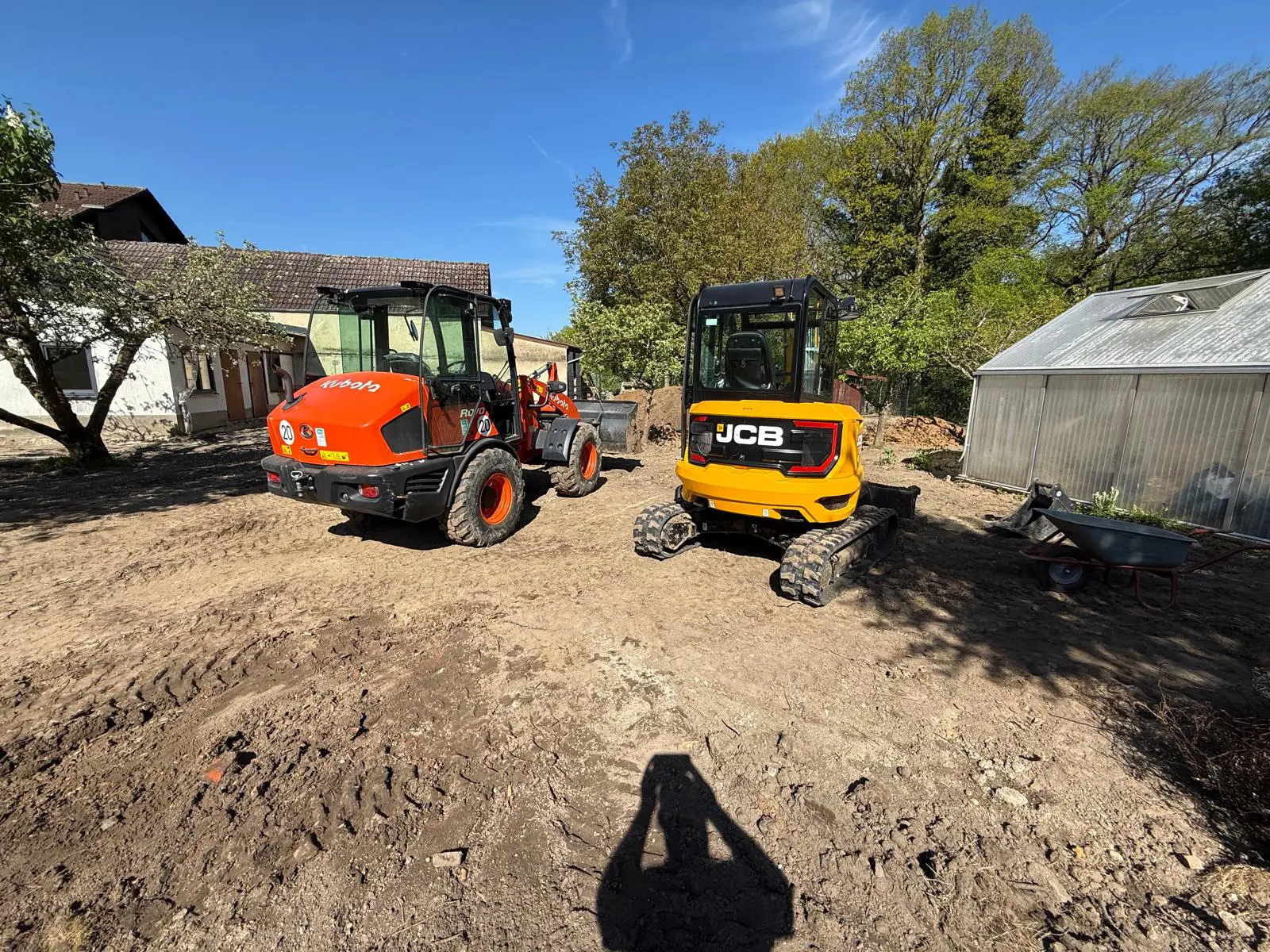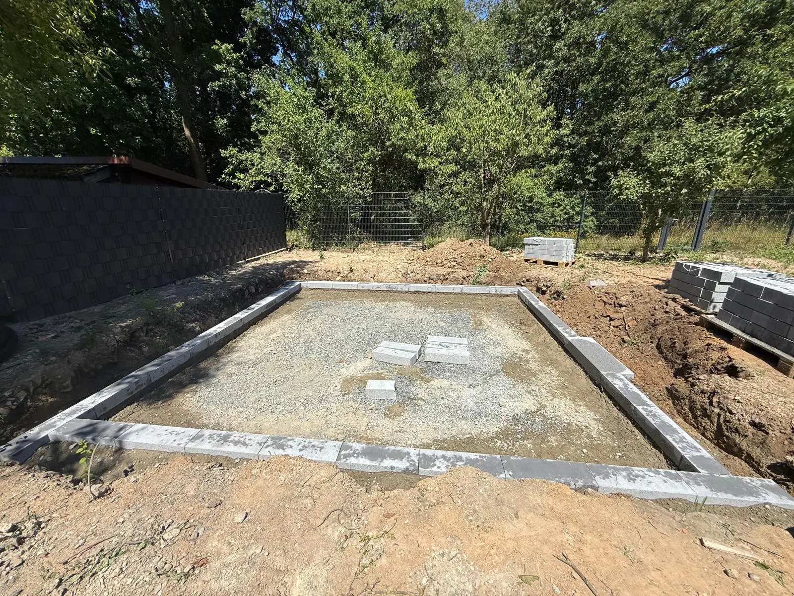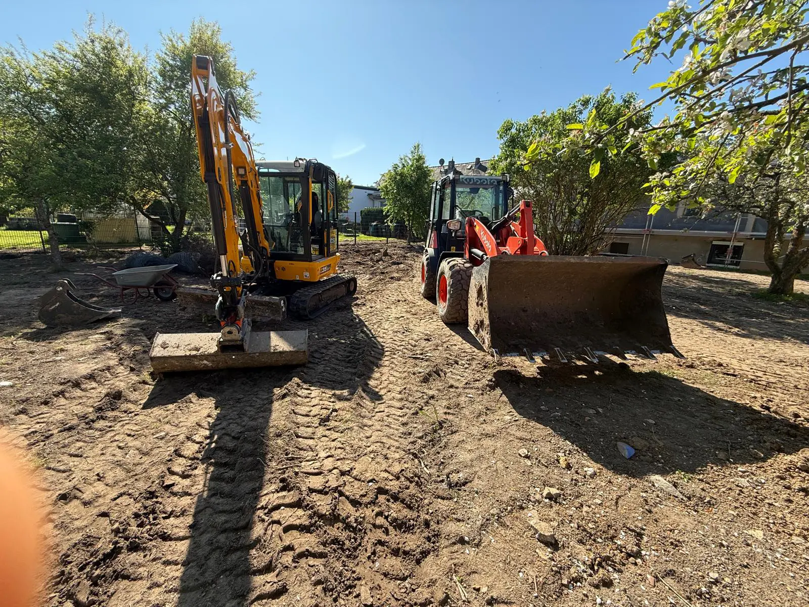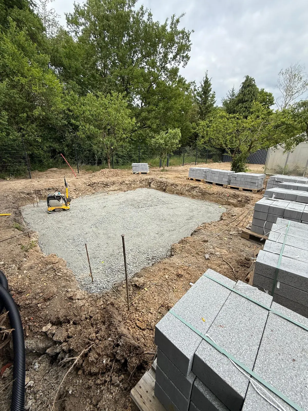 Baggerarbeiten auf Baustelle – Aushub und GeländeprofilierungGepflasterter Hofbereich – Fläche vorbereitet und verdichtet