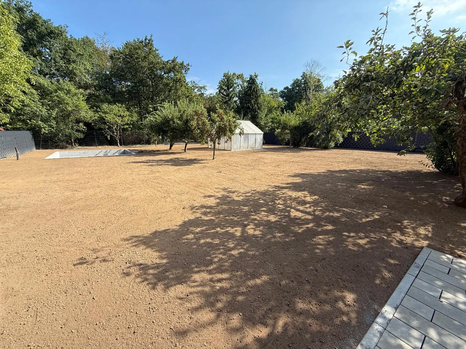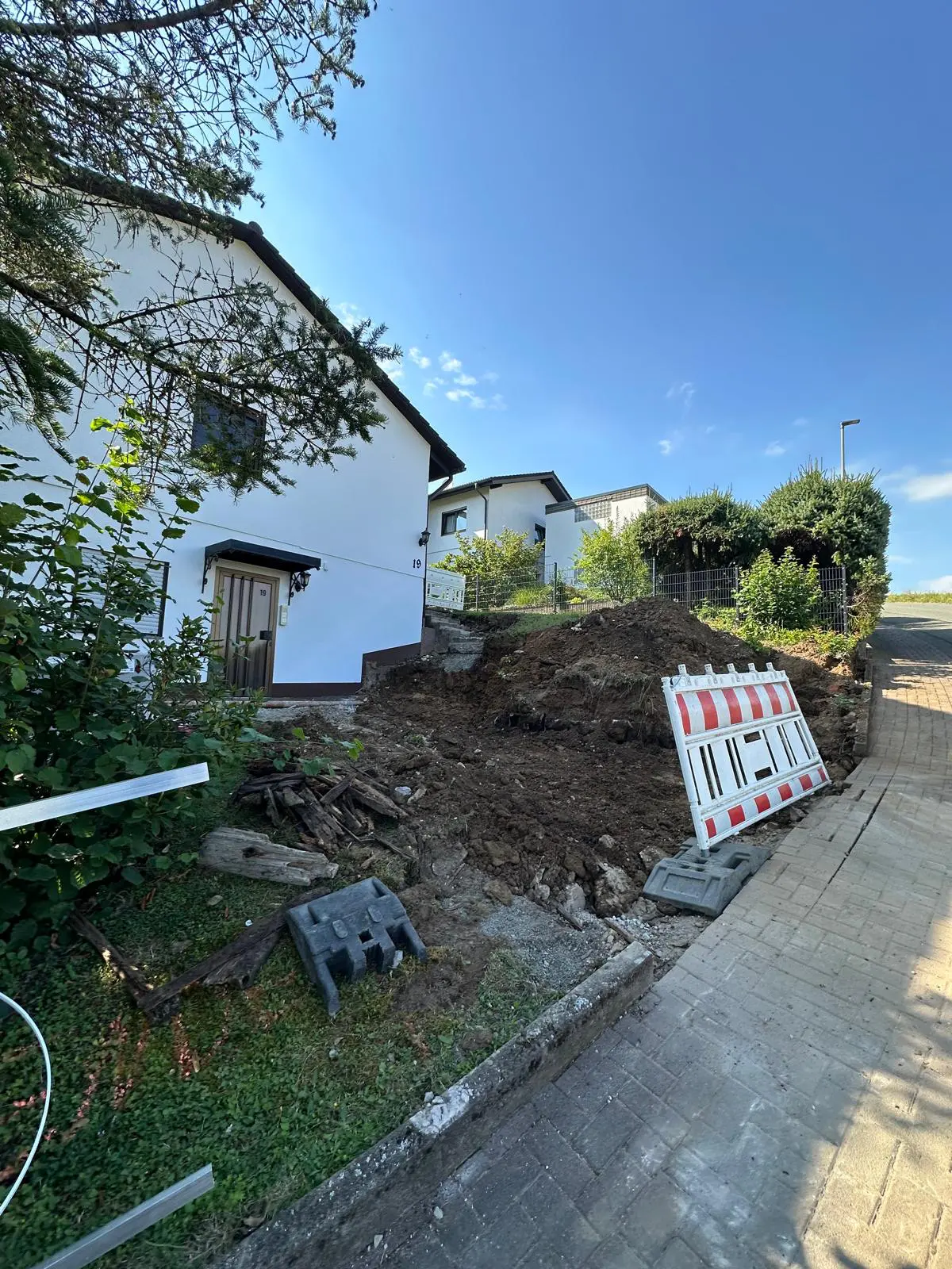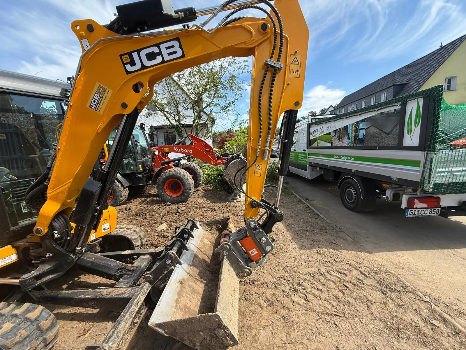 Baggerarbeiten auf Baustelle – Aushub und GeländeprofilierungGepflasterter Hofbereich – Fläche vorbereitet und verdichtet